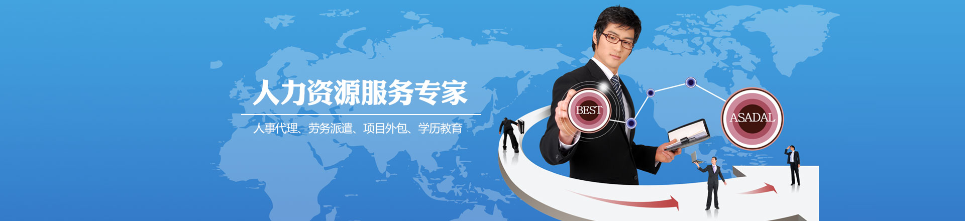 ?????我們將根據(jù)各企事業(yè)單位的需求,提供優(yōu)質(zhì)的人力資源外包服務(wù)。在面向二十一世紀(jì)的今天,我們將與時(shí)俱進(jìn)的順應(yīng)國(guó)際化人力資源發(fā)展趨勢(shì),創(chuàng)新、超越、不斷進(jìn)取,以我們的專業(yè)為客戶創(chuàng)造更大的價(jià)值,追求與客戶共同展開(kāi)騰飛的雙翼,努力創(chuàng)造明日的輝煌。
